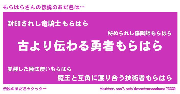 | 男性向けラノベタイトル風あだ名 | 『もらはらという概念が存在しない退屈な世界 』 |