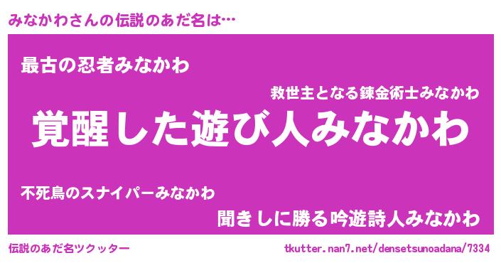 | 男性向けラノベタイトル風あだ名 | 『みなかわ~年齢イコール彼女いない歴の魔法使い~』 |