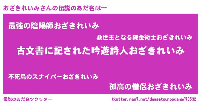 | 男性向けラノベタイトル風あだ名 | 『おざきれいみ~年齢イコール彼女いない歴の魔法使い~』 |
