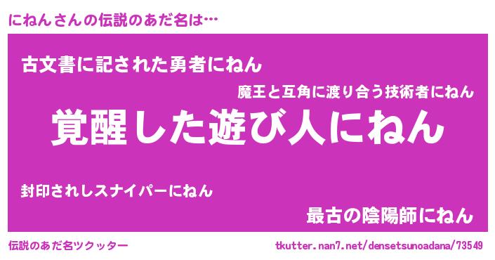 | 意味不明あだ名 | 『とにかく怪しいにねん』『自称にねん』 |