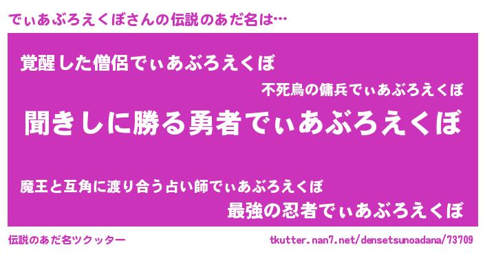 | 女子向けラノベタイトル風あだ名 | 『異世界で失敗しない100のでぃあぶろえくぼ』 |