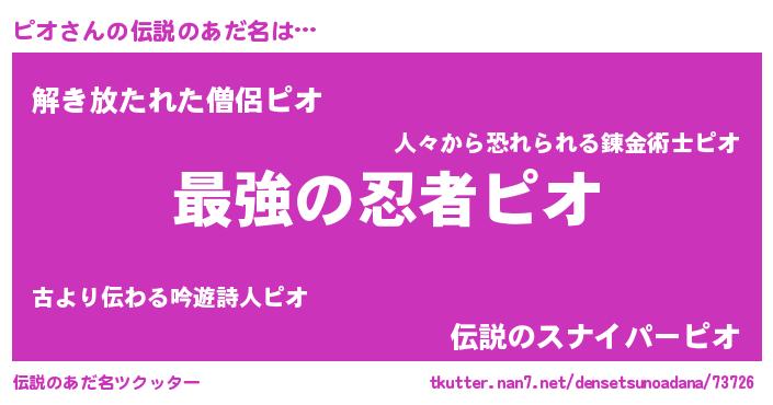 | 男性向けラノベタイトル風あだ名 | 『ピオに滅ぼされるだけの簡単なお仕事です』 |