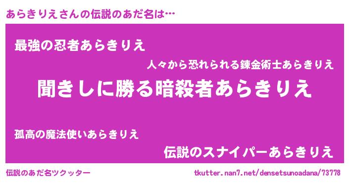 | 男性向けラノベタイトル風あだ名 | 『あらきりえという概念が存在しない退屈な世界 』 |