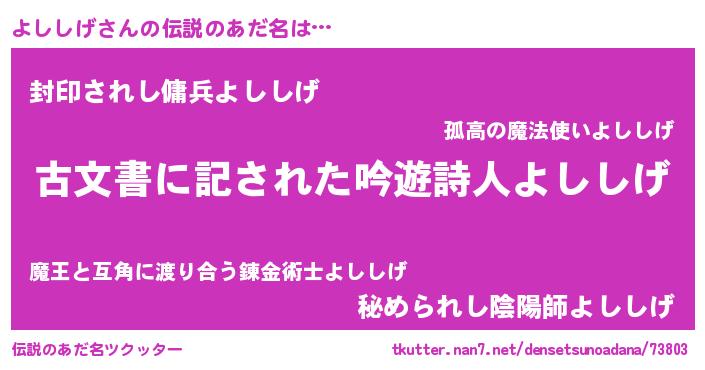 | 男性向けラノベタイトル風あだ名 | 『よししげ~年齢イコール彼女いない歴の魔法使い~』 |