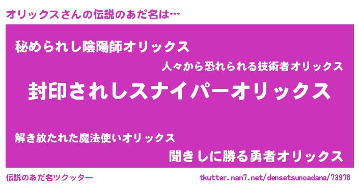 | 男性向けラノベタイトル風あだ名 | 『この素晴らしい世界にオリックスを!』 |
