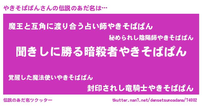 | 女子向けラノベタイトル風あだ名 | 『異世界で失敗しない100のやきそばぱん』 |
