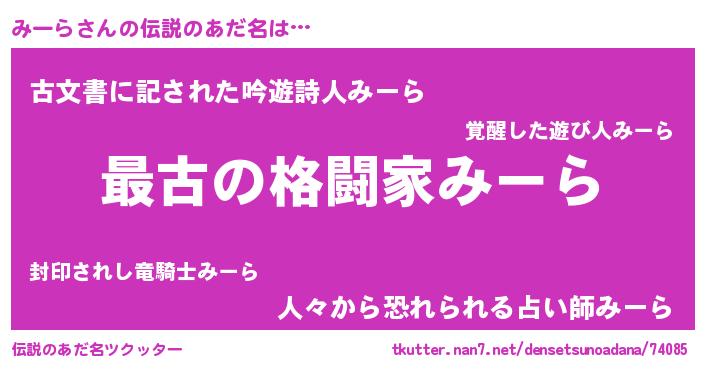 | 男性向けラノベタイトル風あだ名 | 『転生したらみーらだった件』 |