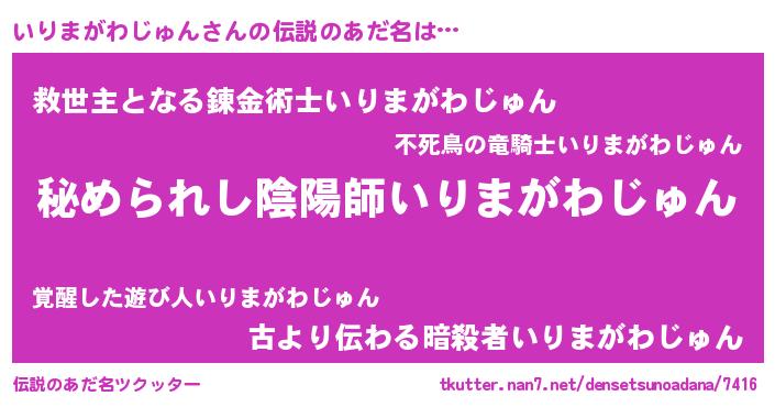 | 女子向けラノベタイトル風あだ名 | 『いりまがわじゅんが死なない童話 林檎のいりまがわじゅんの診療簿』 |