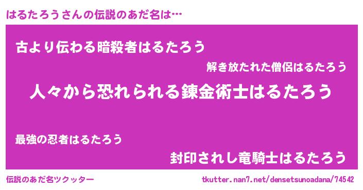 | 男性向けラノベタイトル風あだ名 | 『おまえをオタクにしてやるから、俺をはるたろうにしてくれ! 』 |