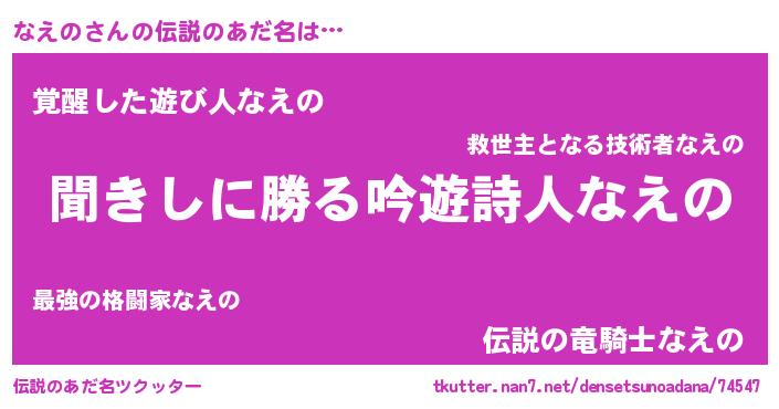 | 意味不明あだ名 | 『住所不定無職なえの(2歳)』『自称なえの』 |