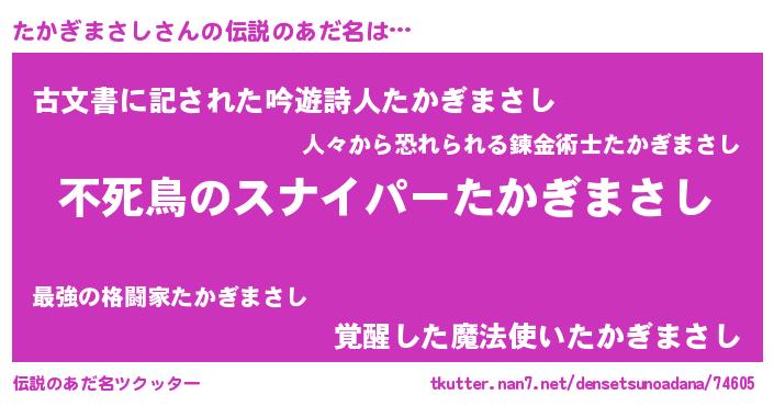 | 肩書あだ名 | 『たかぎまさし御曹司』 |