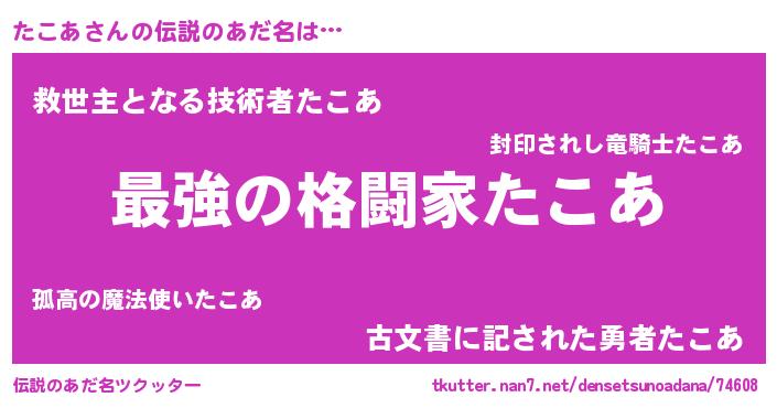 | 男性向けラノベタイトル風あだ名 | 『たこあ~年齢イコール彼女いない歴の魔法使い~』 |