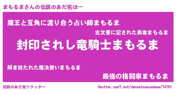 | 男性向けラノベタイトル風あだ名 | 『Re:まもるまから始める異世界生活』 |