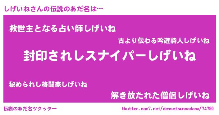 | 男性向けラノベタイトル風あだ名 | 『しげいねに滅ぼされるだけの簡単なお仕事です』 |