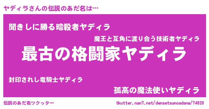 | ヒーロー風カッコイイあだ名 | 『ウルトラヤディラマン』『ネオヤディラ』 |