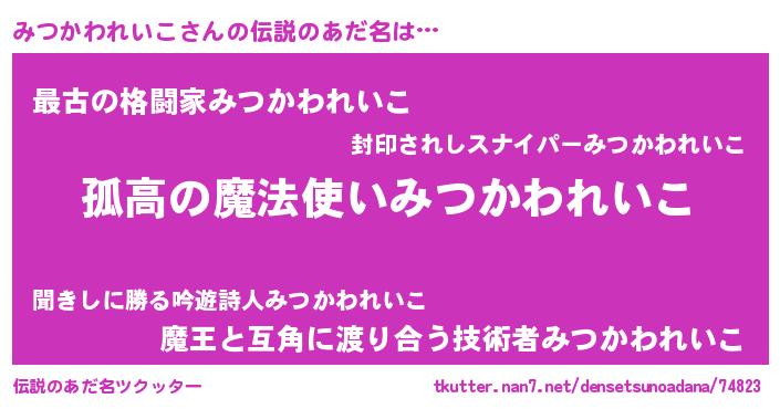| 胡散臭い通販商品みたいなあだ名 | 『信頼と実績のサプリメント…その名も「みつかわれいこ」』 |