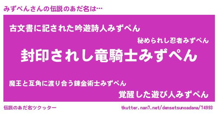 | 男性向けラノベタイトル風あだ名 | 『みずぺんに滅ぼされるだけの簡単なお仕事です』 |