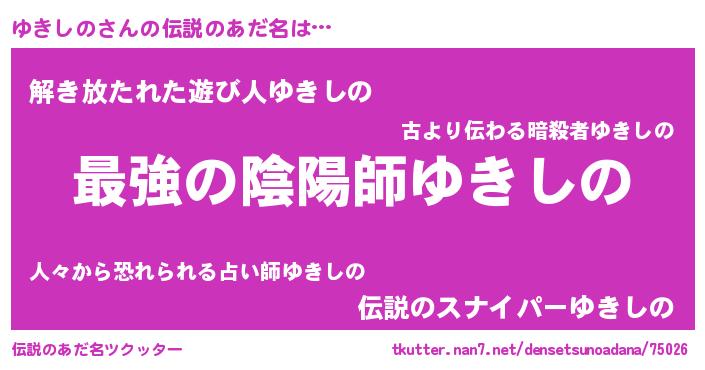 | 男性向けラノベタイトル風あだ名 | 『ゆきしの~年齢イコール彼女いない歴の魔法使い~』 |