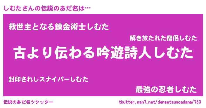 | 女子向けラノベタイトル風あだ名 | 『乙女ゲームの破滅フラグしかない悪役しむたに転生してしまった…』 |