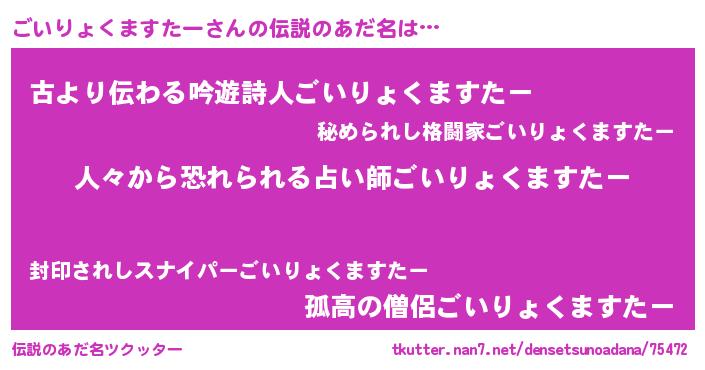 | 女子向けラノベタイトル風あだ名 | 『ごいりょくますたーなんてお断りですっ。』 |