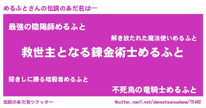 | 女子向けラノベタイトル風あだ名 | 『死神めるふとの再婚』 |