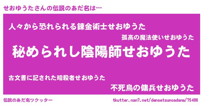 | ヒーロー風カッコイイあだ名 | 『仮面セオダー』『正義の使者せおゆうた』 |