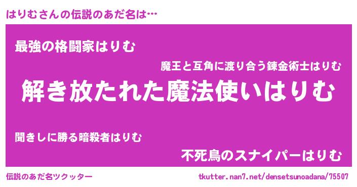 | 女子向けラノベタイトル風あだ名 | 『はりむの卵を拾いまして』『闇のはりむ』 |