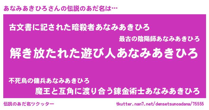 | 男性向けラノベタイトル風あだ名 | 『転生したらあなみあきひろだった件』 |