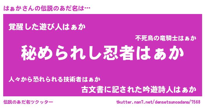 | ヒーロー風カッコイイあだ名 | 『ウルトラはぁかマン』『幻影騎士ハァ』 |