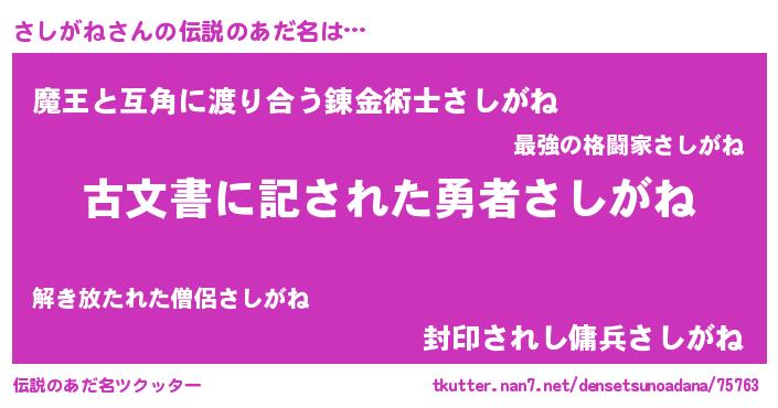 | 意味不明あだ名 | 『自称さしがね』『永久保存さしがね』 |