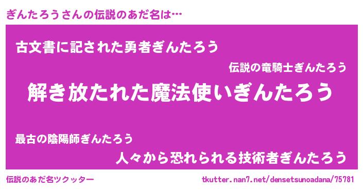 | 女子向けラノベタイトル風あだ名 | 『乙女ゲームの破滅フラグしかない悪役ぎんたろうに転生してしまった…』 |