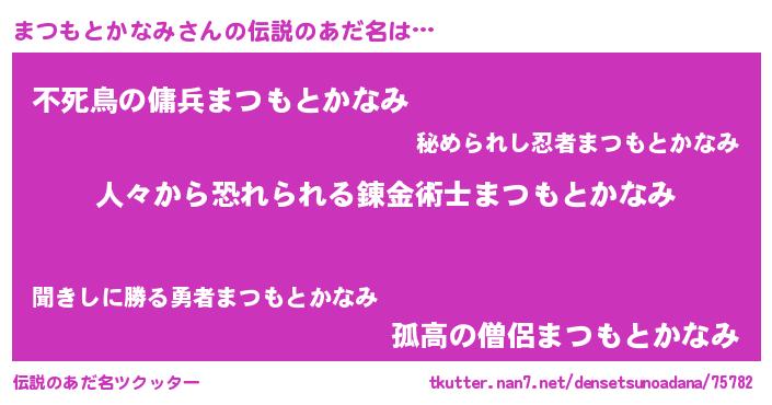 | 胡散臭い通販商品みたいなあだ名 | 『ハリウッド女優が絶賛した世界で10本だけ現存している希少なブランデー…その名も「まつもとかなみ」』 |