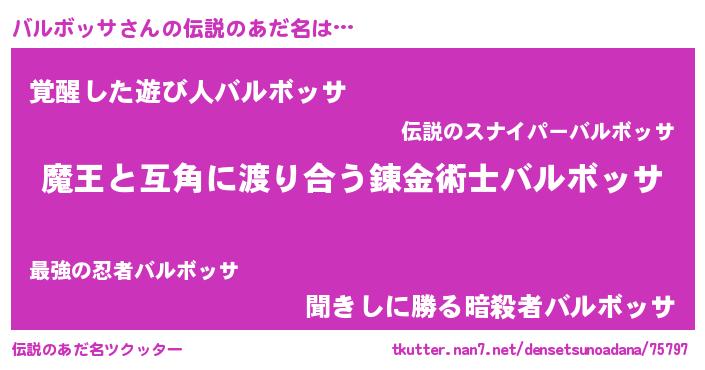 | 女子向けラノベタイトル風あだ名 | 『乙女ゲームの破滅フラグしかない悪役バルボッサに転生してしまった…』 |