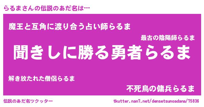 | 男性向けラノベタイトル風あだ名 | 『らるまという概念が存在しない退屈な世界 』 |