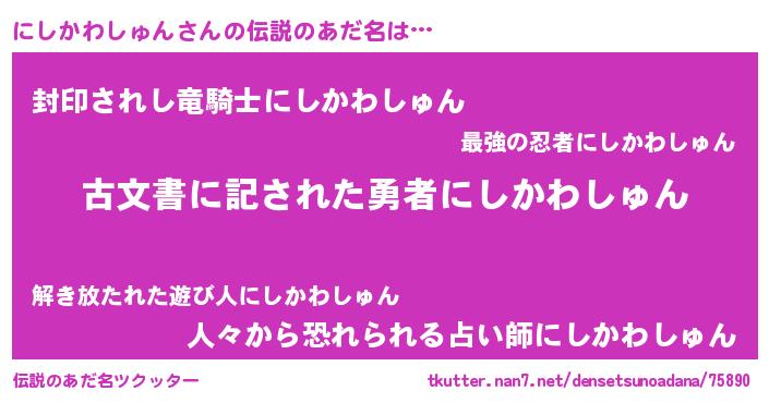 | 男性向けラノベタイトル風あだ名 | 『にしかわしゅん~年齢イコール彼女いない歴の魔法使い~』 |
