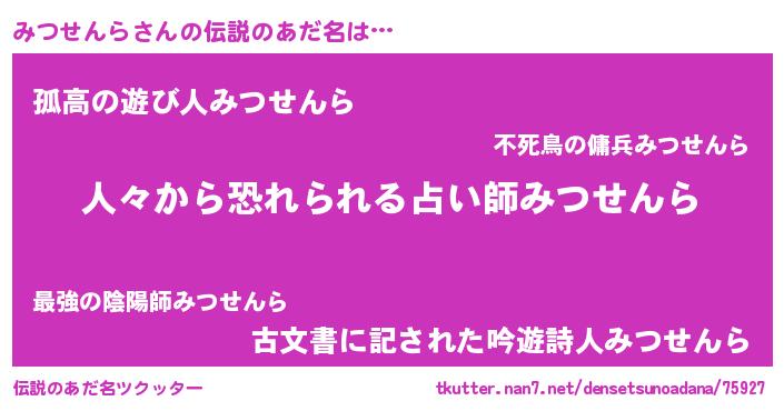 | 男性向けラノベタイトル風あだ名 | 『おまえをオタクにしてやるから、俺をみつせんらにしてくれ! 』 |