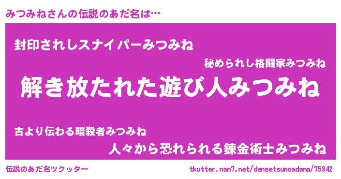 | 男性向けラノベタイトル風あだ名 | 『みつみねの嫁は女の子じゃないと思った?』 |