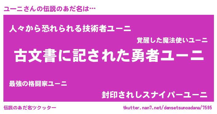 | ヒーロー風カッコイイあだ名 | 『ネオユーニ』『慈愛の使者ユーニ』 |