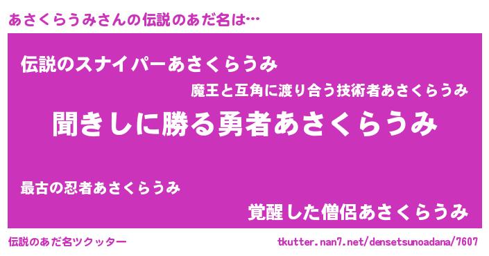 | ヒーロー風カッコイイあだ名 | 『仮面アサダー』『ネオアサクラウミ』 |
