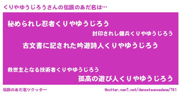 | 男性向けラノベタイトル風あだ名 | 『うちのくりやゆうじろうが世界を掌握している!』 |