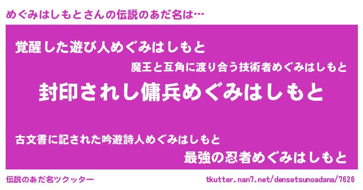 | 意味不明あだ名 | 『住所不定無職めぐみはしもと(62歳)』 |