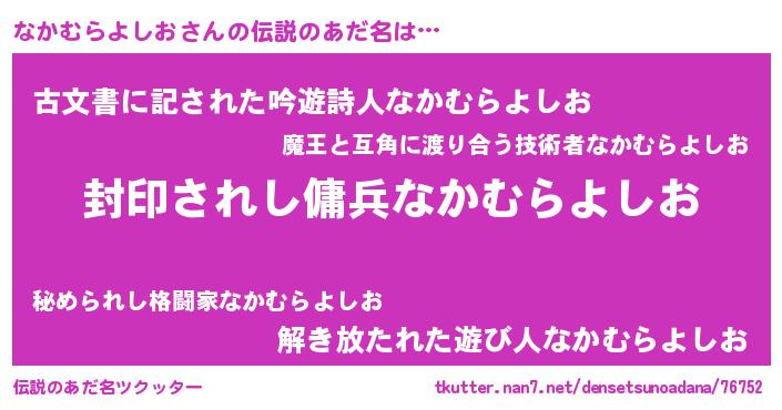 | 男性向けラノベタイトル風あだ名 | 『なかむらよしおに滅ぼされるだけの簡単なお仕事です』 |