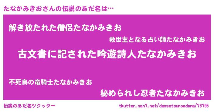 | ヒーロー風カッコイイあだ名 | 『ネオタナカミキオ』『炎刃騎士タナ』 |