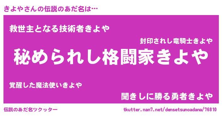| ヒーロー風カッコイイあだ名 | 『超時空戦士キヨヤ』『慈愛の使者きよや』 |