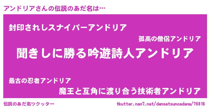 | 意味不明あだ名 | 『永久保存アンドリア』『自称アンドリア』 |