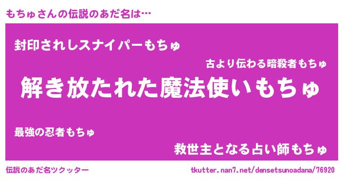 | 意味不明あだ名 | 『とにかく怪しいもちゅ』『自称もちゅ』 |