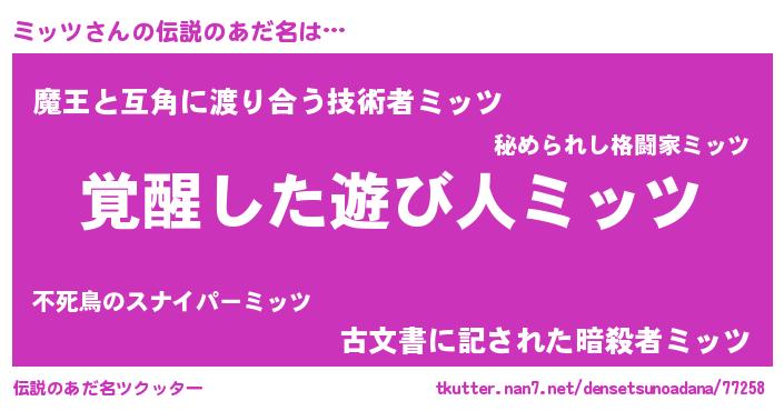 | ヒーロー風カッコイイあだ名 | 『幻影騎士ミッ』『天空の使者ミッツ』 |