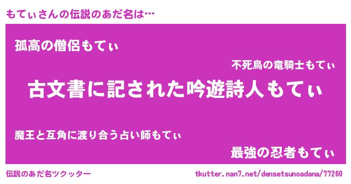 | 胡散臭い通販商品みたいなあだ名 | 『あなたにだけ特別に提供する100年もののヴィンテージワイン…その名も「もてぃ」』 |