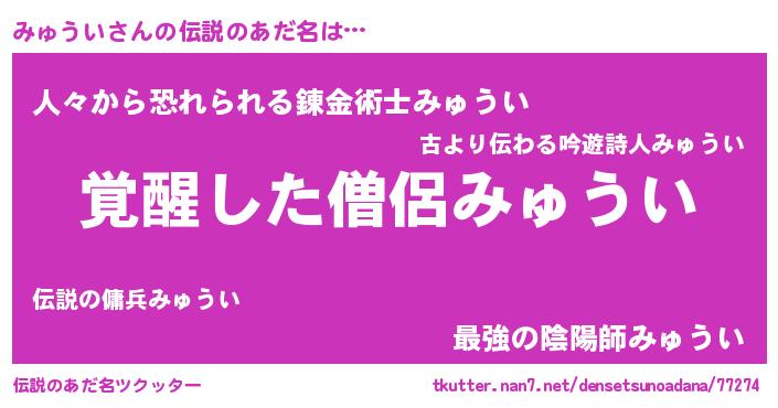 | ヒーロー風カッコイイあだ名 | 『天弓騎士ミュ』『正義の使者みゅうい』 |