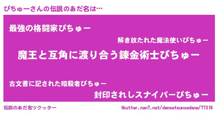 | ヒーロー風カッコイイあだ名 | 『愛の使者ぴちゅー』『最強戦士ピチュー』 |